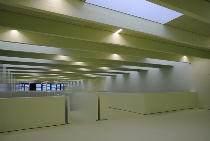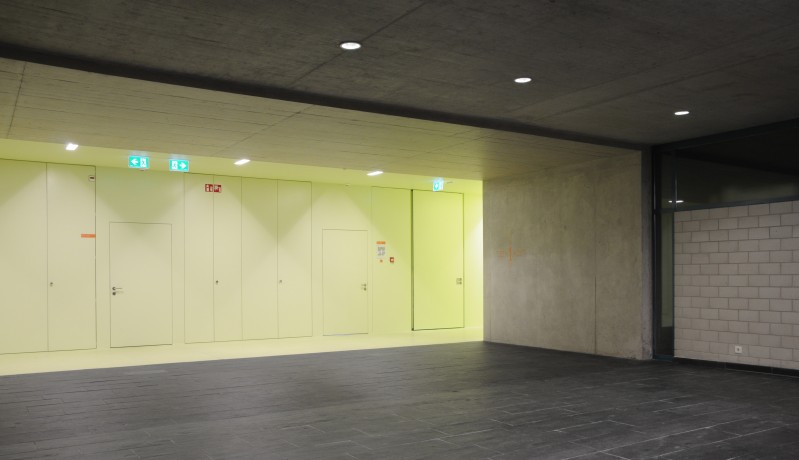A l’intérieur, histoire de marquer à la fois la ligne de fracture et de contact entre les deux entités, les sols, les murs, les charpentes et les plafonds sont peints en vert tilleul, chaud et clair, gommant les textures des matériaux utilisés. En revanche, dans les salles de classe, nous avons opté pour un traitement plus neutre où le blanc et le gris prédominent.